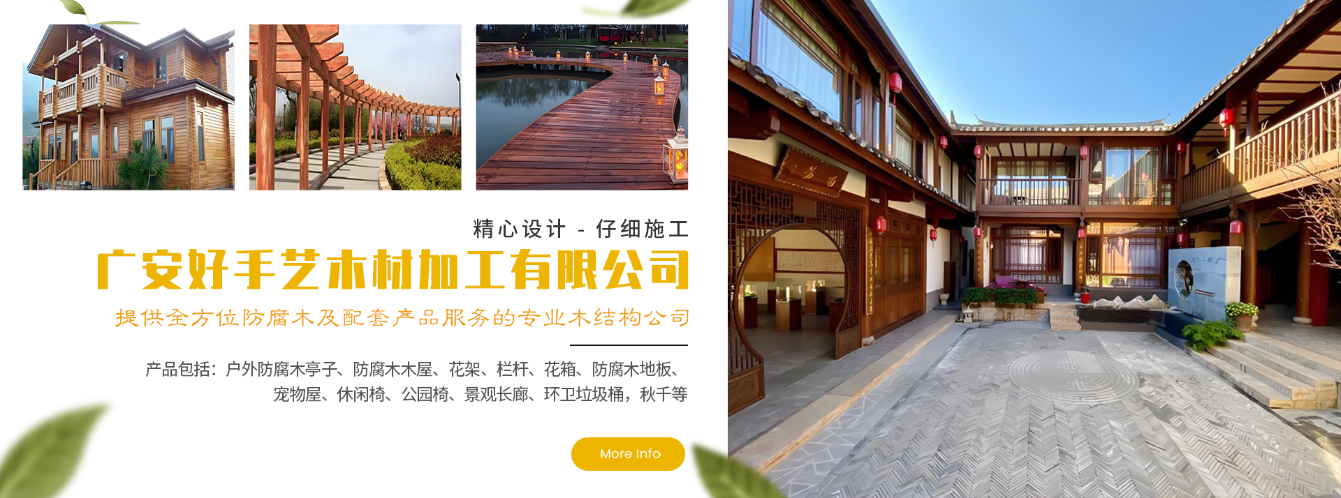 廣安好手藝木材加工有限公司專業(yè)從事防腐木木材的生產(chǎn)及銷售,企業(yè)立足防腐木材生產(chǎn)、銷售、設計、咨詢?yōu)橐惑w的綜合性企業(yè),產(chǎn)品包括:戶外防腐木亭子、防腐木木屋、花架、欄桿、花箱、防腐木地板、寵物屋、休閑椅、公園椅、景觀長廊、環(huán)衛(wèi)垃圾桶,秋千等公共配套設施的生產(chǎn)、銷售、安裝。